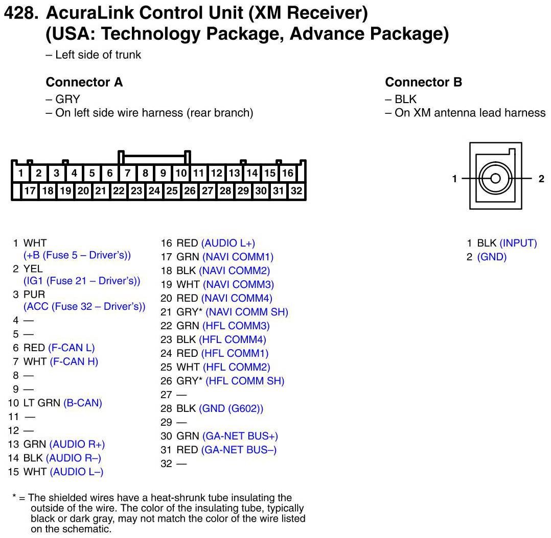 View 428 - AcuraLink Control Unit (XM Receiver) Connector View (USA: Technology Package, Advance Package)