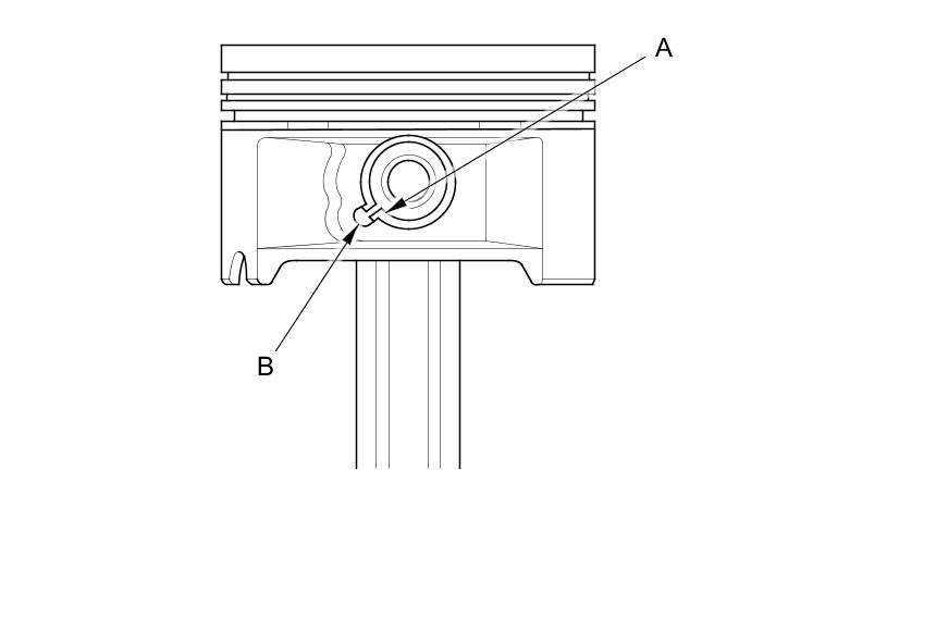 2. Apply new engine oil to the piston pin snap rings (A) and turn them in the ring grooves until the end gaps are lined up with the cutouts in the piston pin bores (B).