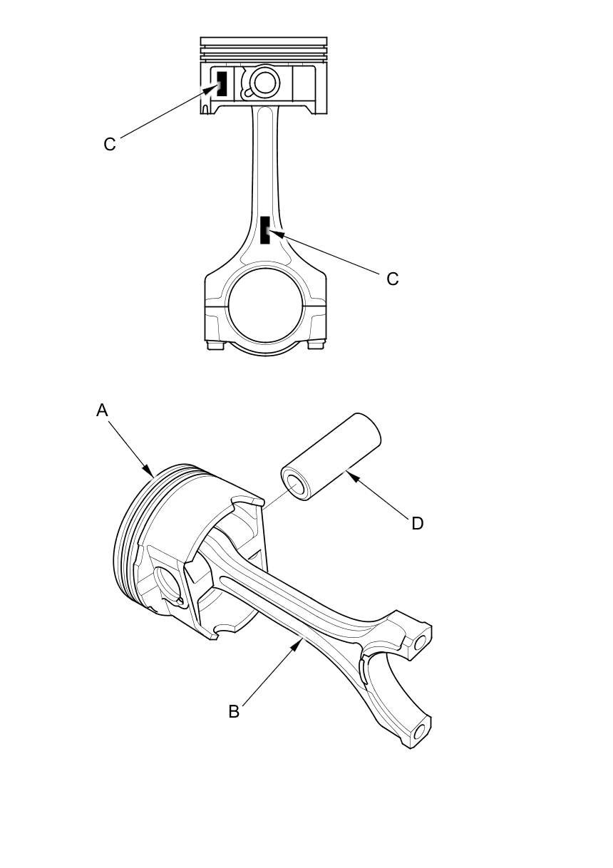 4. Assemble the piston (A) and the connecting rod (B) with the embossed marks (C) on the same side. Install the piston pin (D).