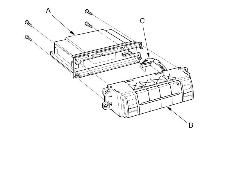 4. Remove the self-tapping screws, then carefully separate the climate control unit (A) from the climate control panel (B). Disconnect the connector (C) from the climate control unit. Do not kink or pull on the wires between the control panel and the control unit. Do not touch the electronic components on the printed circuit board in the control unit and the control panel.