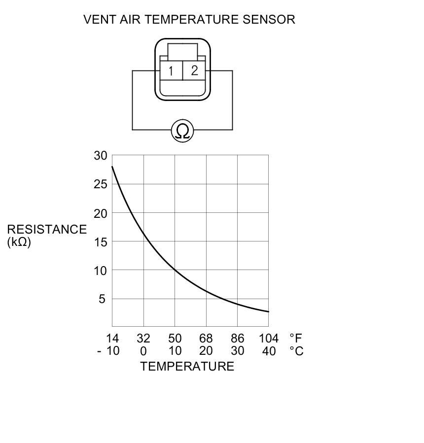 3. Compare the resistance reading between terminals No. 1 and No. 2 of the vent air temperature sensor with the specifications shown in the graph; the resistance should be within the specifications.