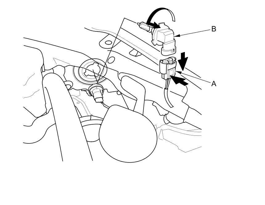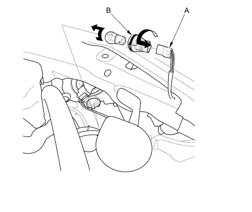 4. Disconnect the 2P connector (A) from the front parking light/front side marker light bulb socket (B).