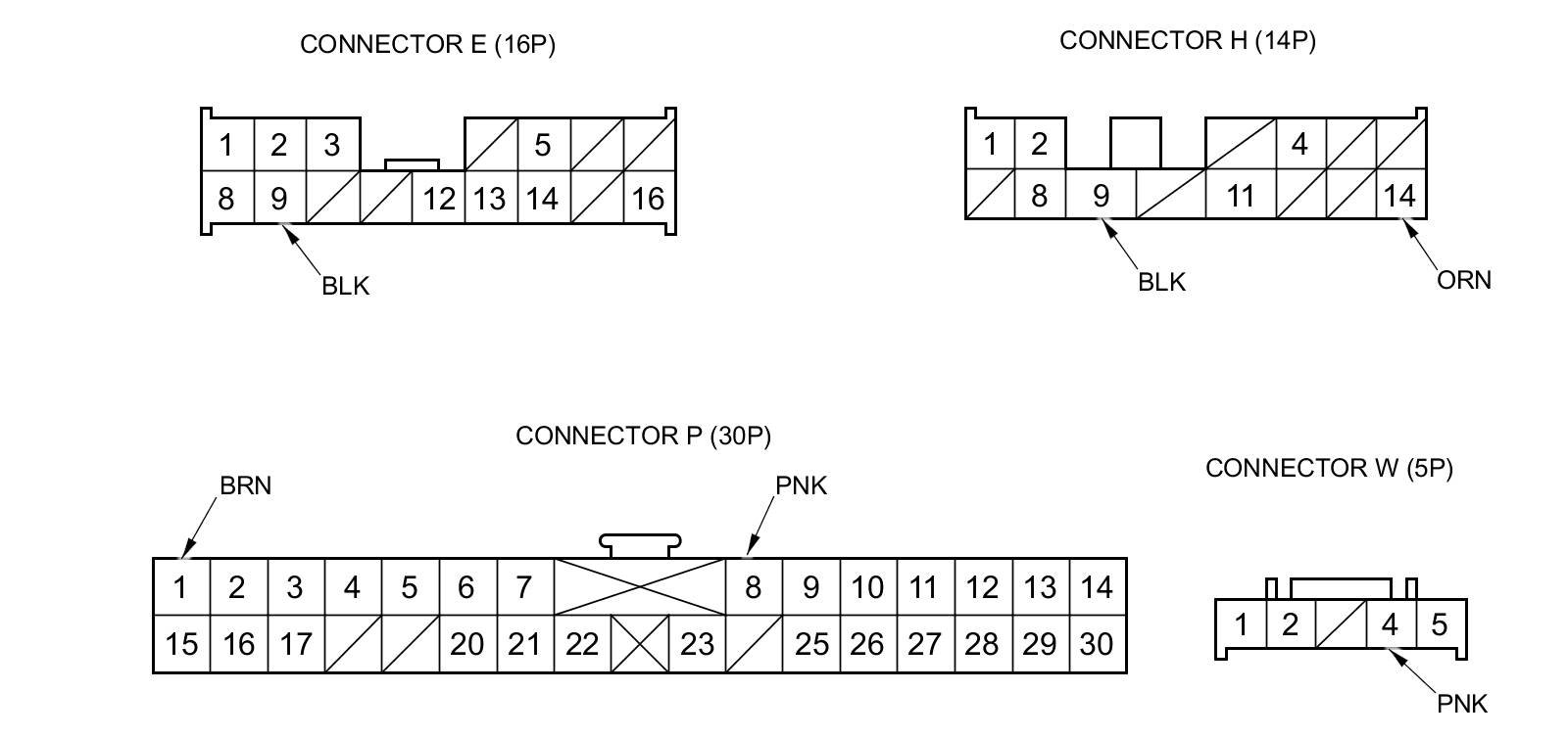 3. Disconnect the driver's under-dash fuse/relay box connectors E, H, P, and W.