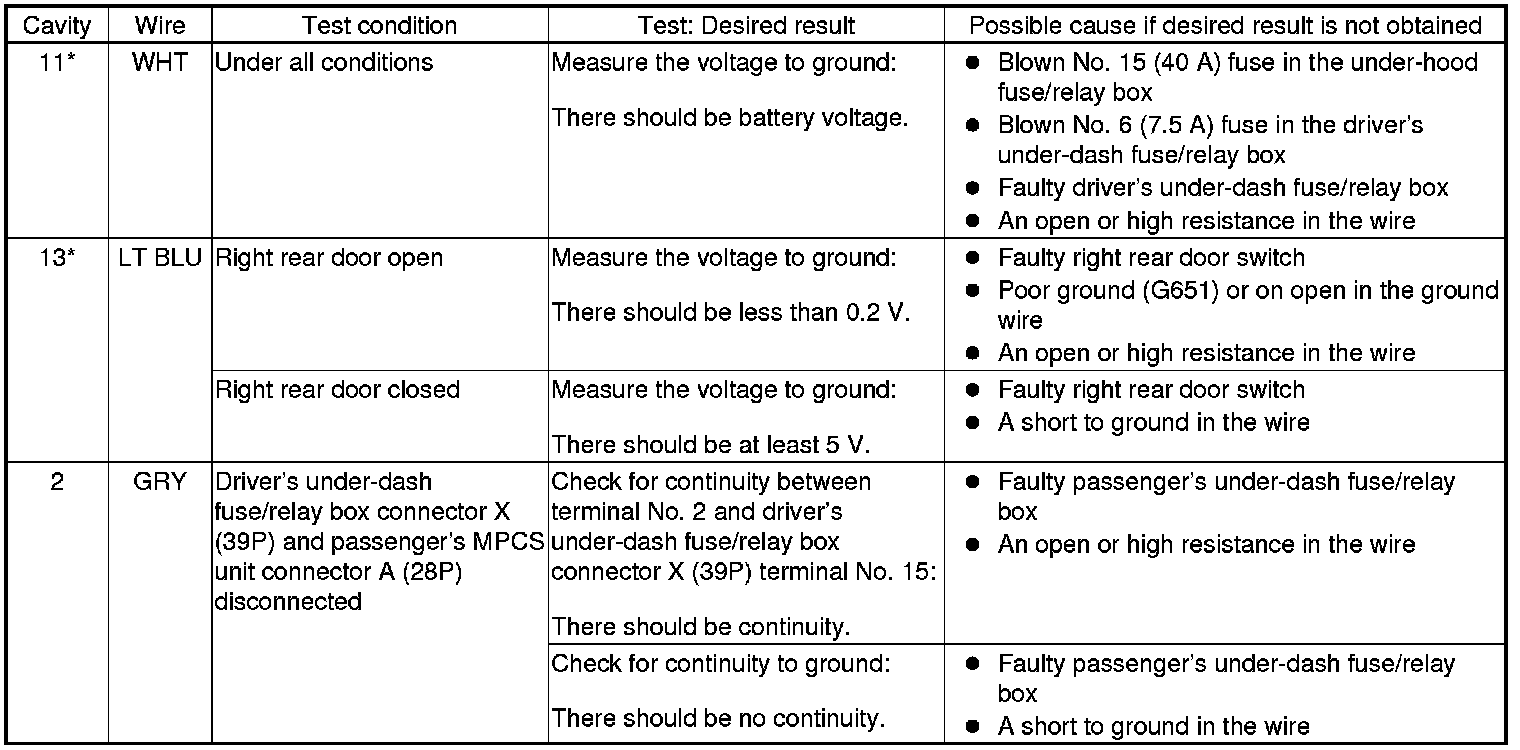 18. Reconnect the connector to the front passenger's MPCS unit, and do the following input tests.