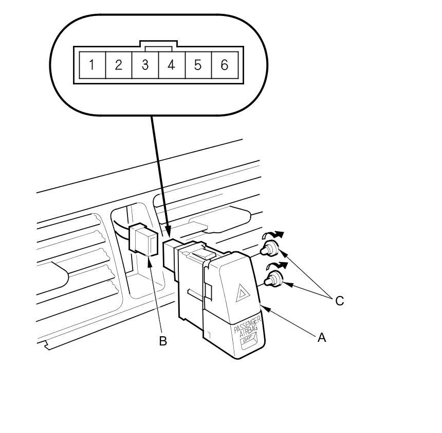 3. Disconnect the 6P connector (B) from the hazard warning switch and pull out the hazard warning switch.
