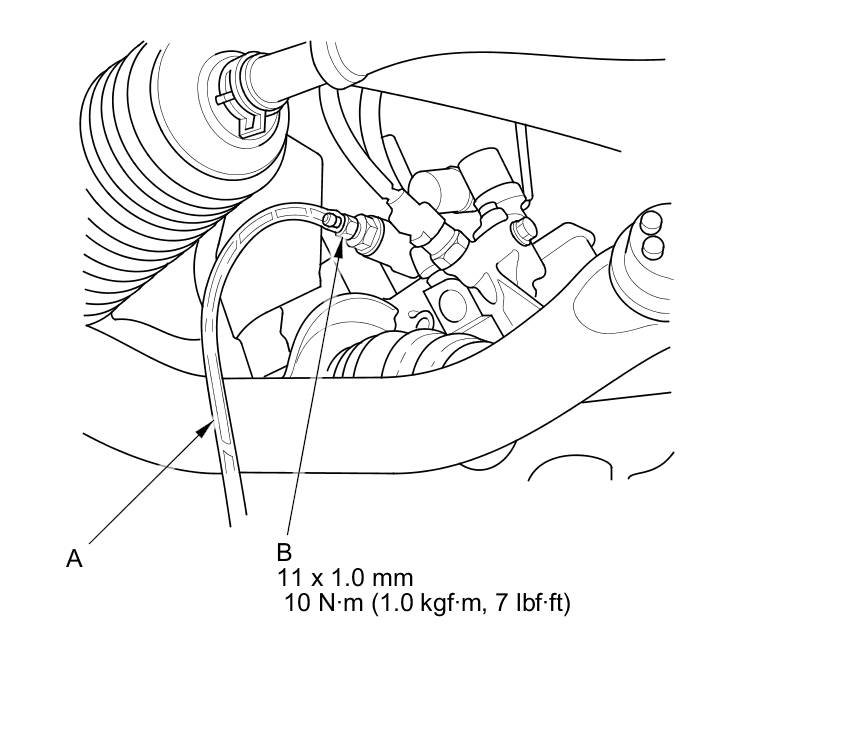 4. Install a rubber hose (A) on the drain bolt (B) located at the rear of the cylinder block, then loosen the drain bolt.