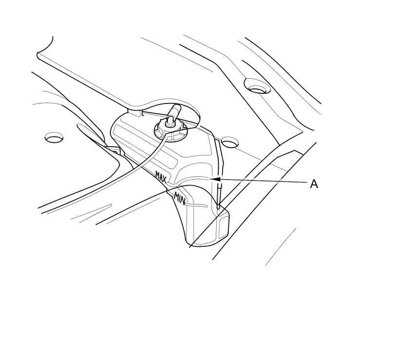 8. Fill the coolant reservoir to the MAX mark (A) with Acura Long Life Antifreeze/Coolant Type 2.