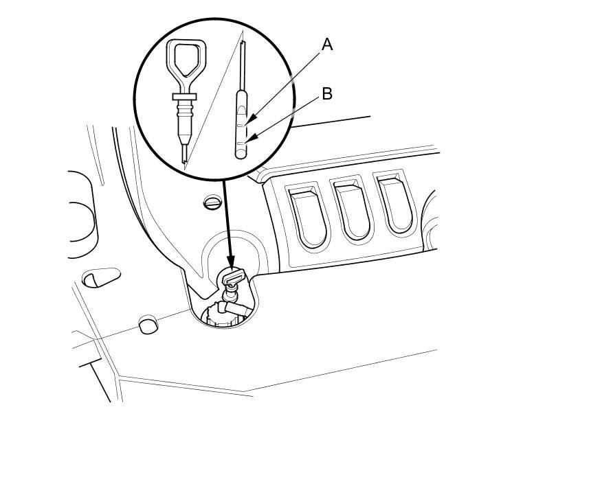 3. Remove the dipstick, and check the engine oil level. It should be between the upper mark (A) and the lower mark (B).