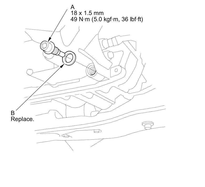 4. Remove the drain plug (A) and the sealing washer (B), and drain the automatic transmission fluid (ATF).