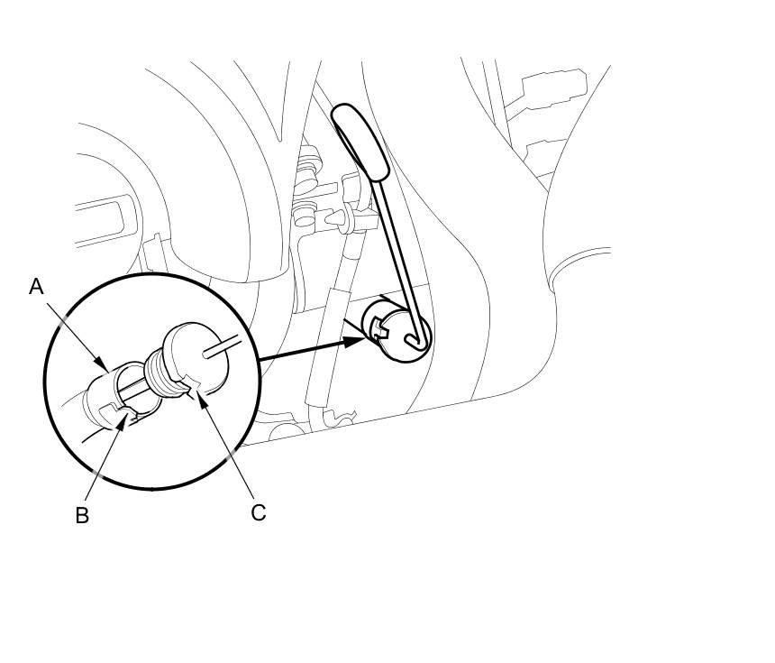 8. Install the dipstick back into the dipstick guide tube (A) aligning the notch (B) with the guide tab (C).