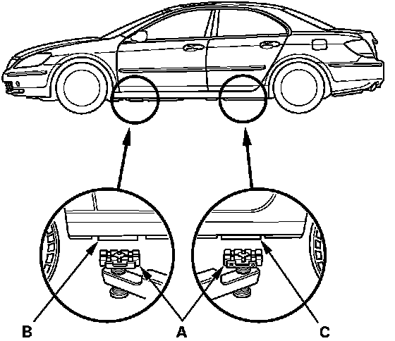 1. Position the hoist lift blocks (A), on safety stands, under the vehicle's front support points (B) and rear�support points (C).