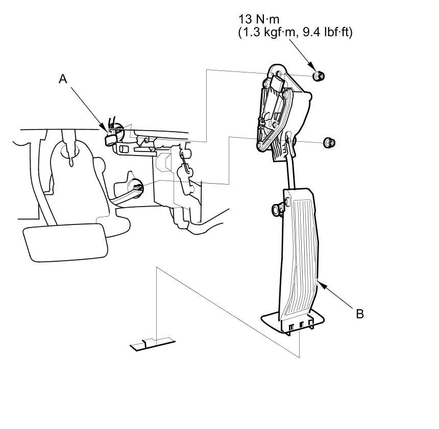 2. Release the lock tab on the base of the accelerator pedal, then remove the accelerator pedal module (B).