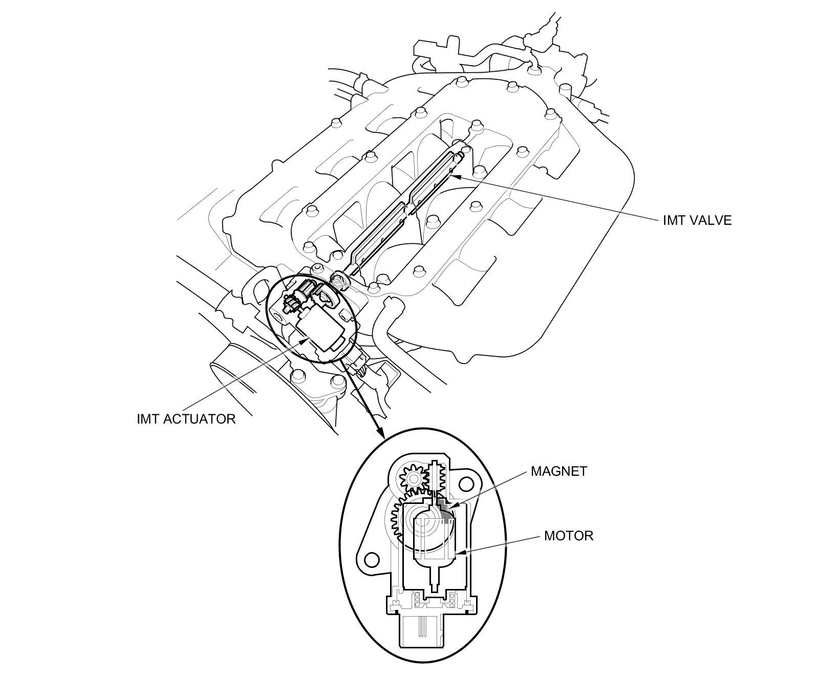 The intake manifold tuning (IMT) actuator contains a sensor that detects the IMT valve position and sends it to the PCM.