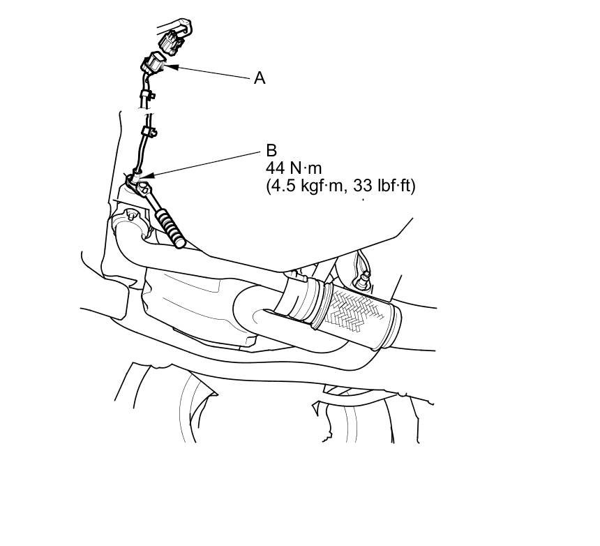 2. Raise the vehicle on a lift, then remove the front secondary HO2S (B).