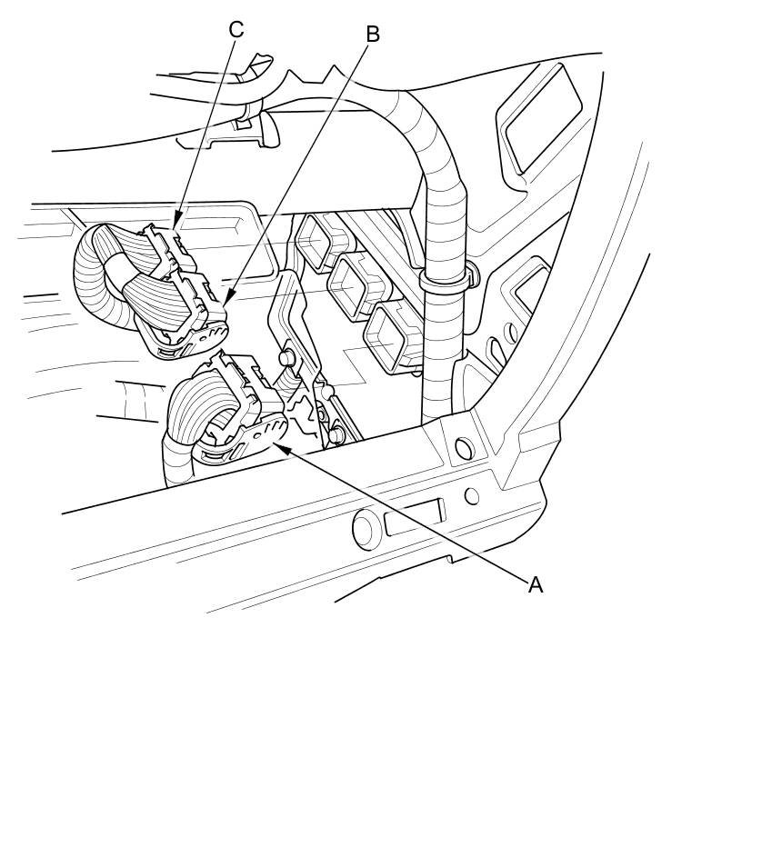 NOTE: PCM connectors A, B, and C have symbols (A=(square), B=(triangle), C=(circle)) embossed on them for identification.