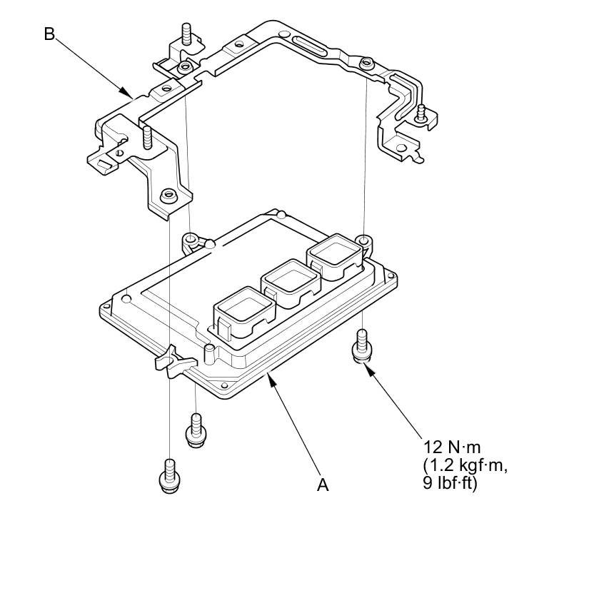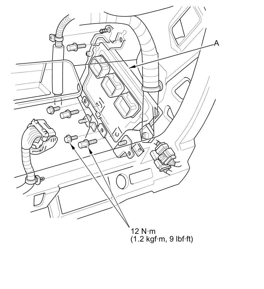 11. Remove the bolts and the harness clips, then remove the PCM (A) with its bracket.