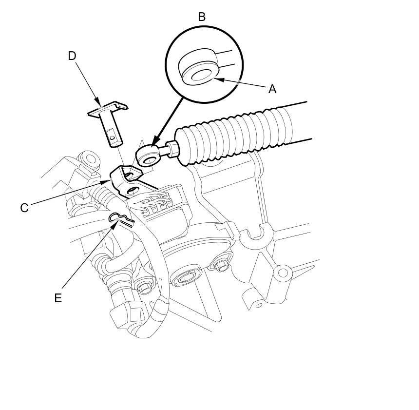 5. Check the bushing (E) in the shift cable end for a proper fit and wear. If the bushing is loose or worn, replace the shift cable Service and Repair.