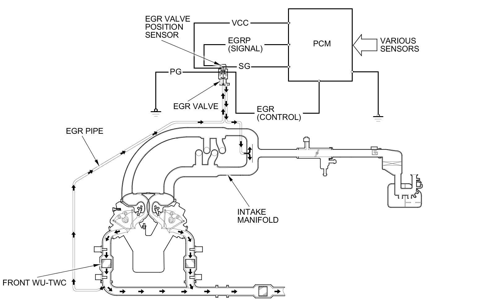 The EGR system reduces oxides of nitrogen (NOx) emissions by recirculating exhaust gas through the EGR pipe to the intake manifold, and into the combustion chambers. Routing the exhaust gas through the EGR pipe after the front WU-TWC helps to prevent carbon deposits from forming in the intake manifold and the throttle body. The PCM memory contains the ideal EGR valve position for varying operating conditions.