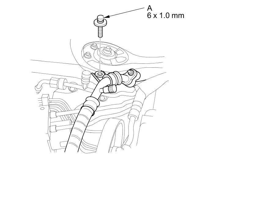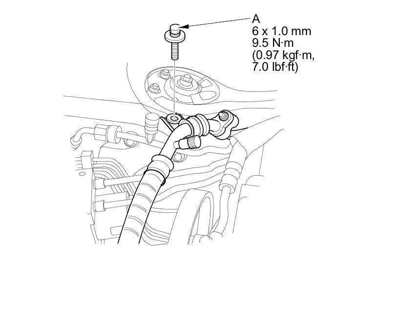 10. Install the A/C line mounting bolt (A).