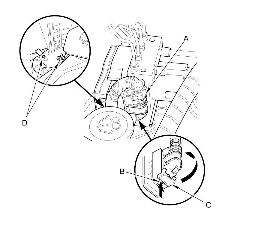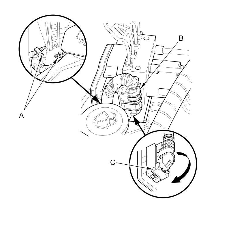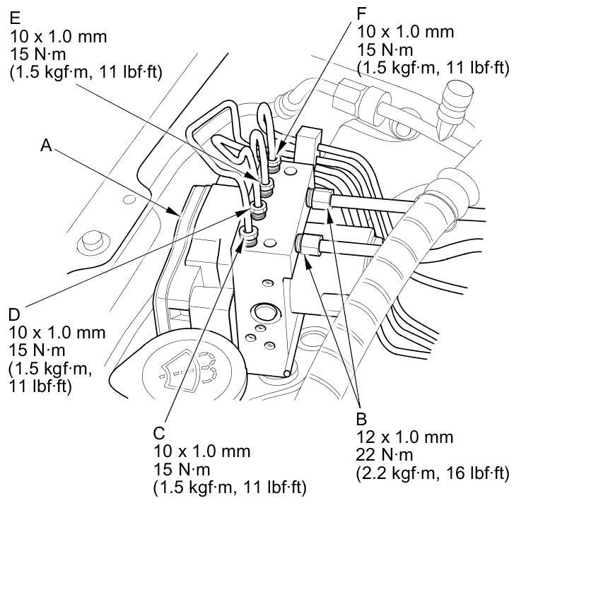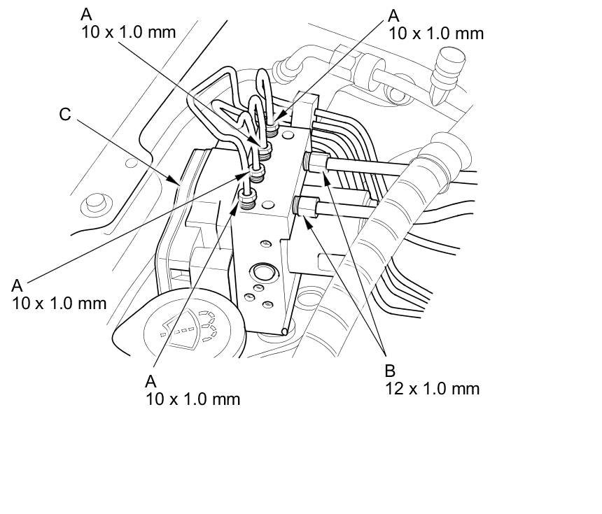 6. Disconnect the 10 mm brake lines (A) and the 12 mm brake lines (B) from the VSA modulator-control unit (C).
