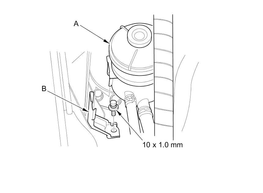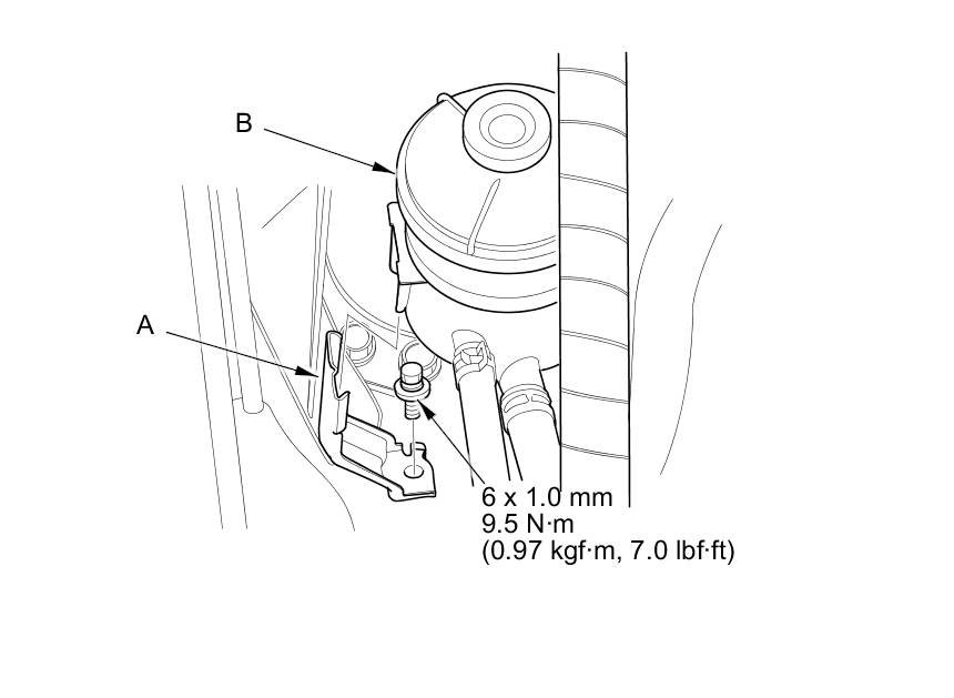 5. Install the power steering fluid reservoir (B) on the power steering fluid reservoir bracket.