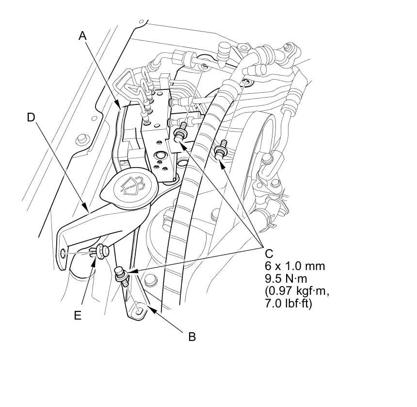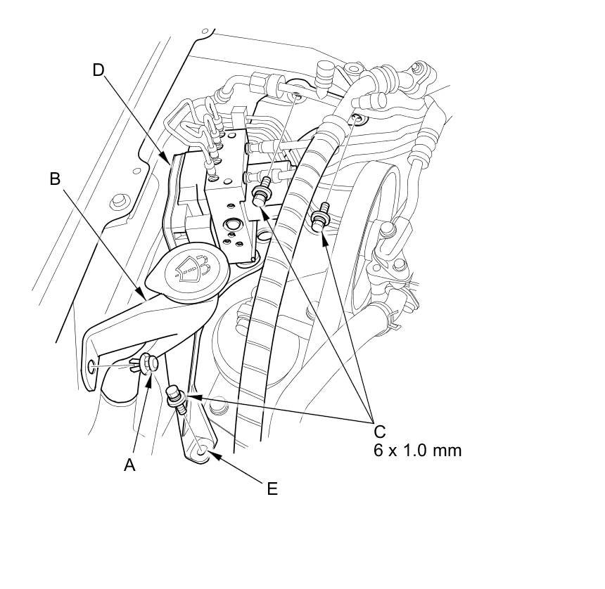 10. Remove the flange bolts (C) , then remove the VSA modulator-control unit (D) with the bracket (E) from the body.