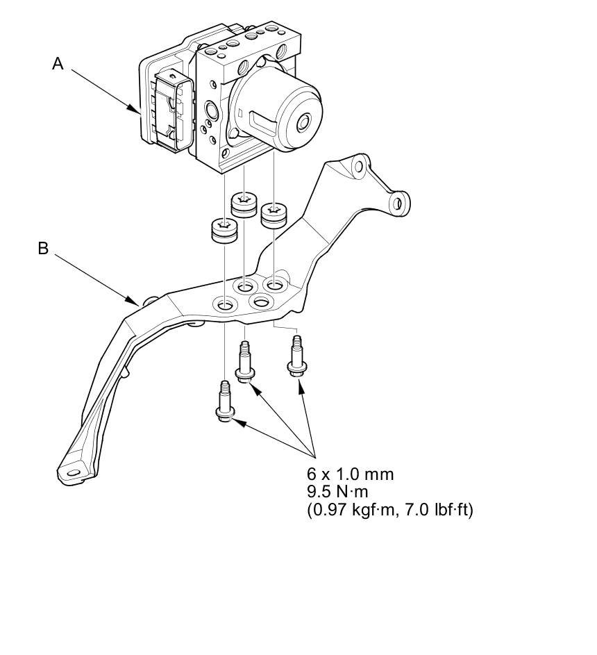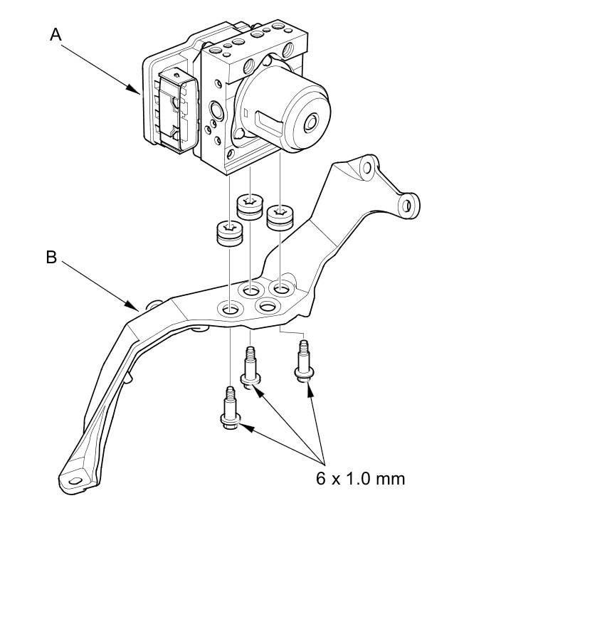1. Install the VSA modulator-control unit (A) onto the bracket (B).
