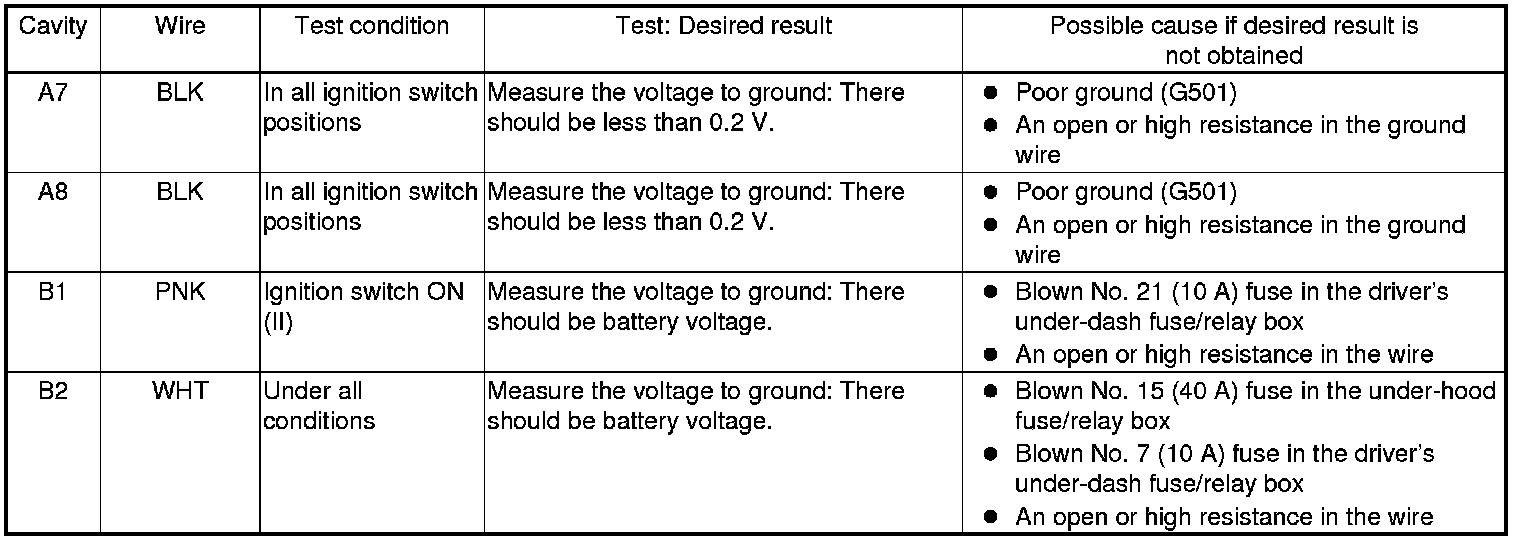 6. Disconnect gauge control module connectors A (20P) and B (28P), and do the following input tests.