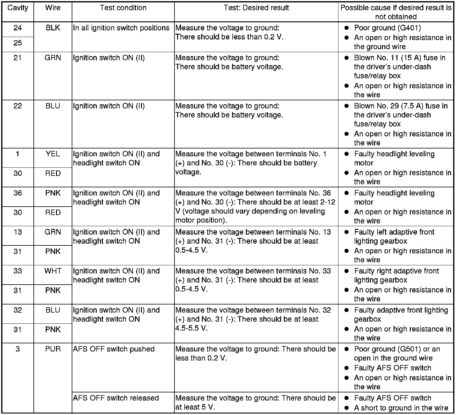 5. Reconnect the 40P connector to the adaptive front lighting control unit, and do the following input tests.