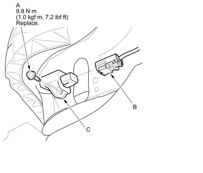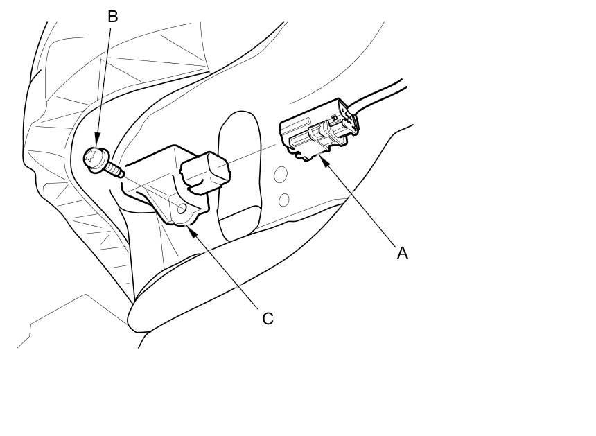 1. Install the front impact sensor with new TORX bolt (A), then connect the engine compartment wire harness 2P connector (B) to the front impact sensor (C).