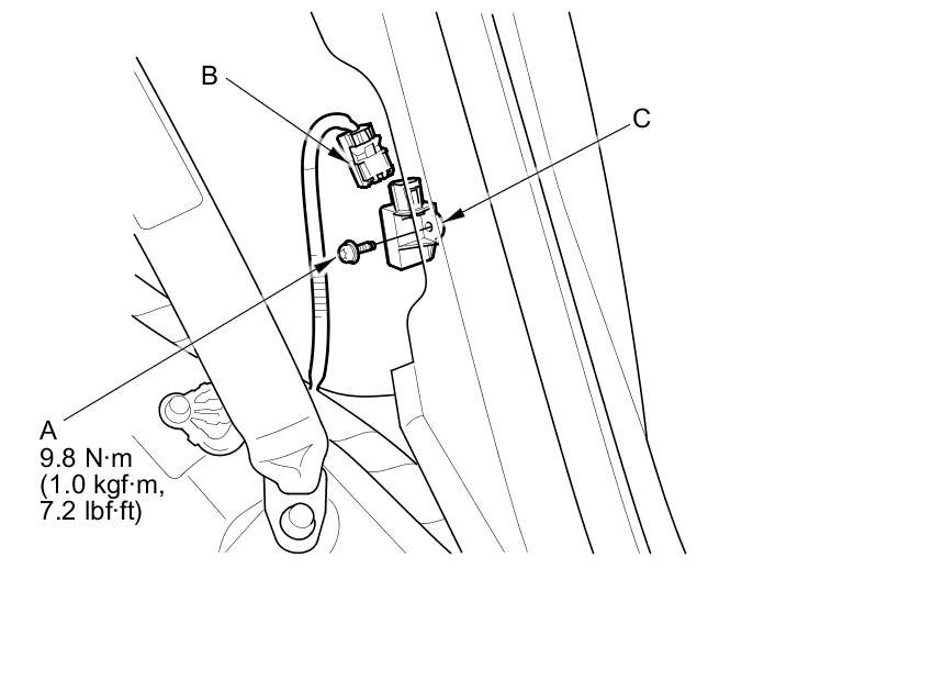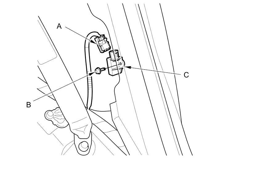 1. Install the side impact sensor (second) with a new TORX bolt (A), then connect the left side wire harness or right wire harness 2P connector (B) to the side impact sensor (second) (C).