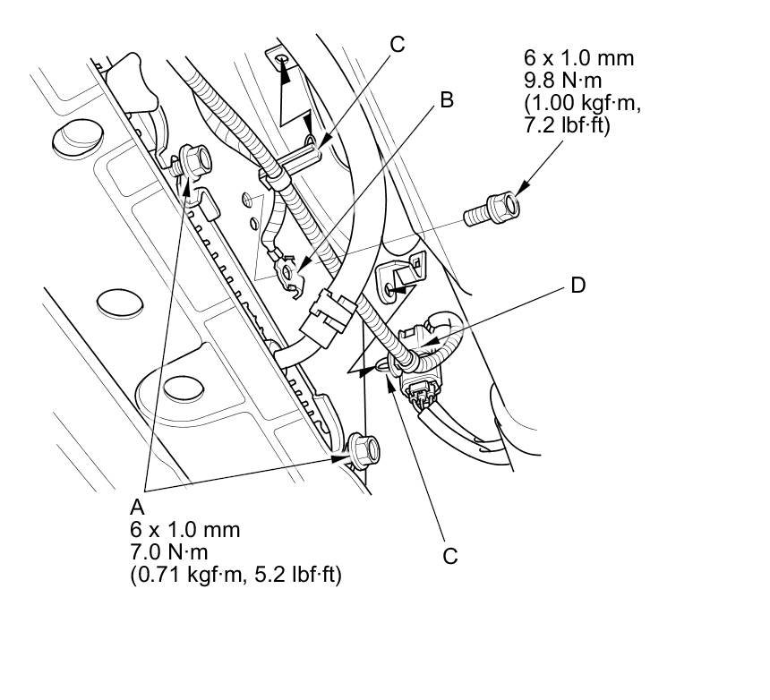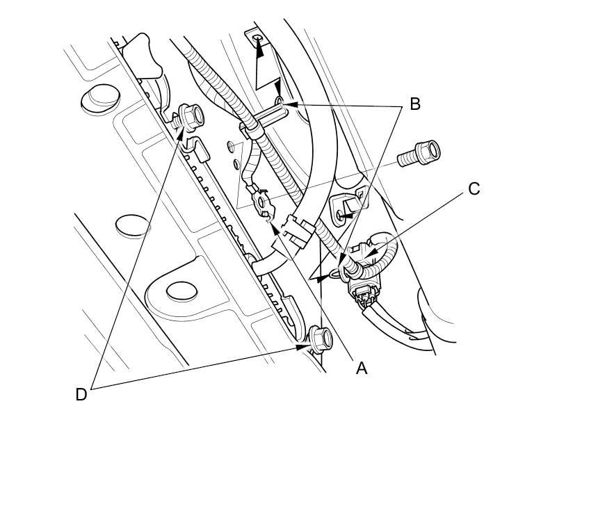 10. Install the ground cable (B), the harness clamps (C), and the connector (D) to the A/C condenser fan shroud.