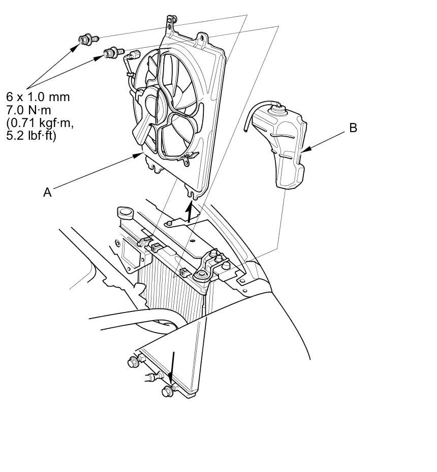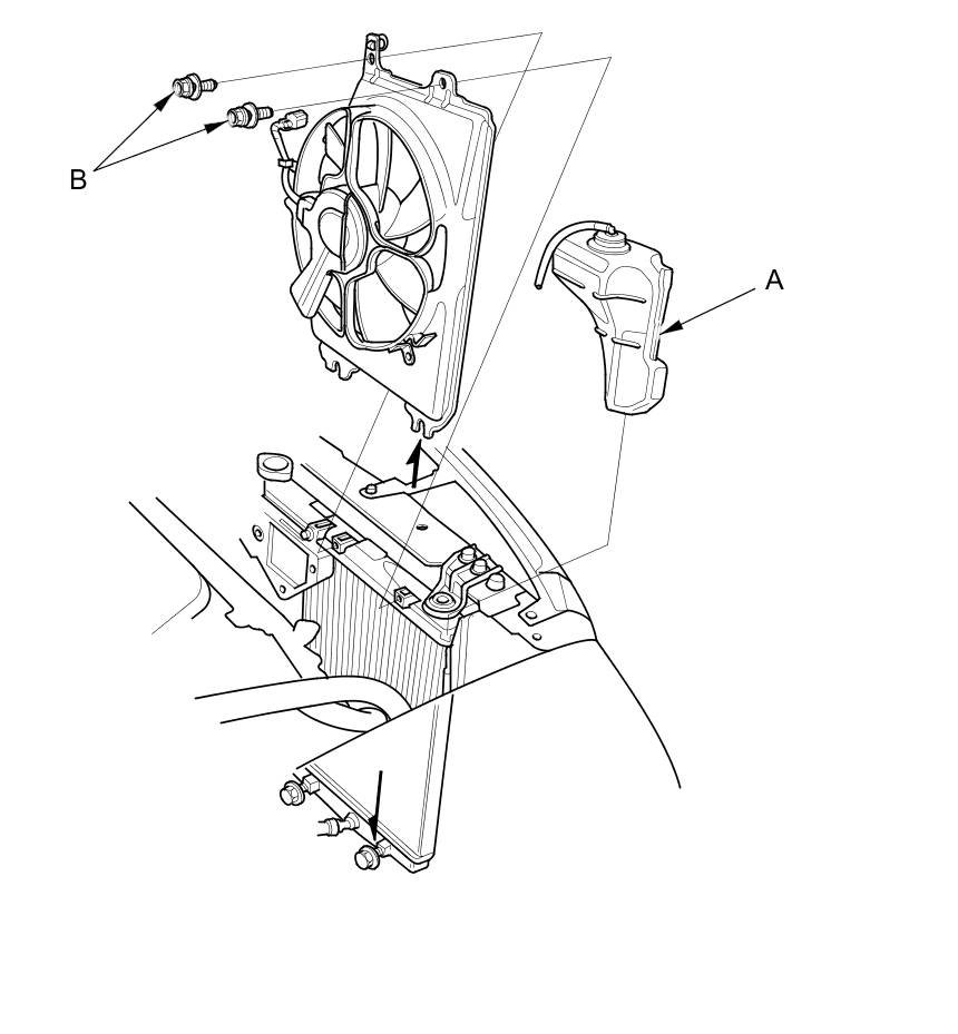 10. Remove the two bolts (B), then remove the A/C condenser fan shroud.
