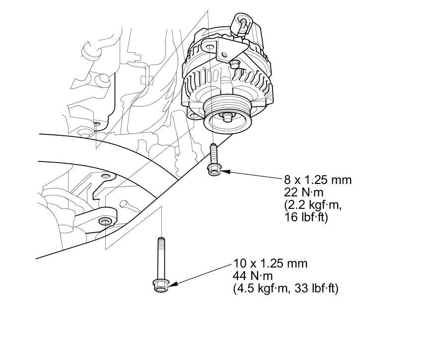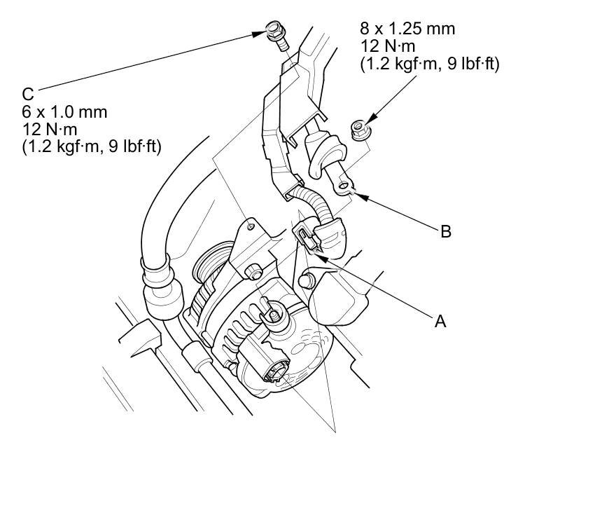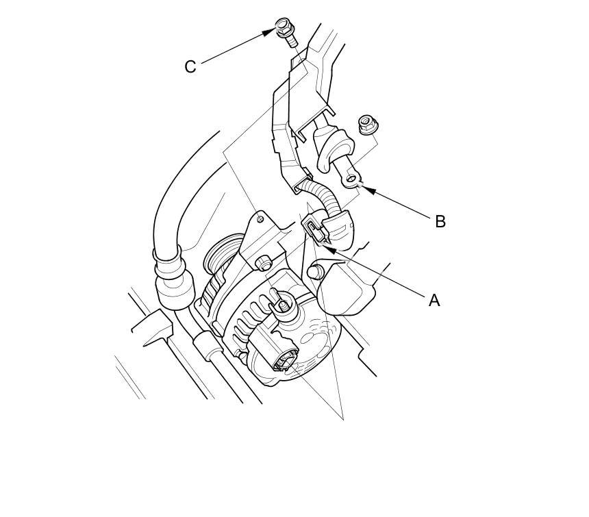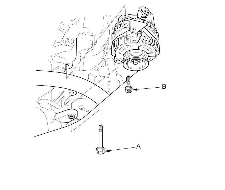 14. Remove the mounting bolt (A) and the alternator bracket mounting bolt (B), then remove the alternator.
