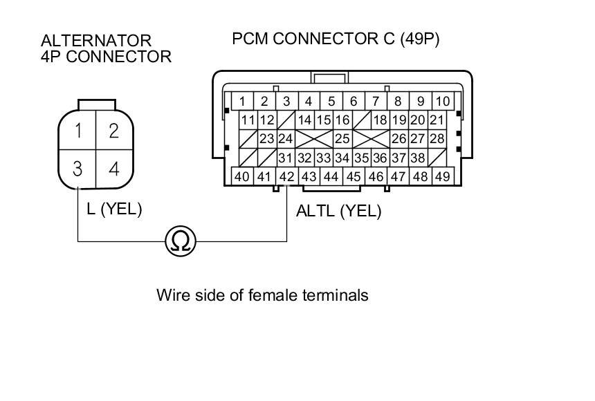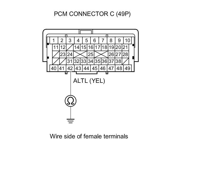 25. Check for continuity between PCM connector terminal C42 and alternator 4P connector terminal No. 3.