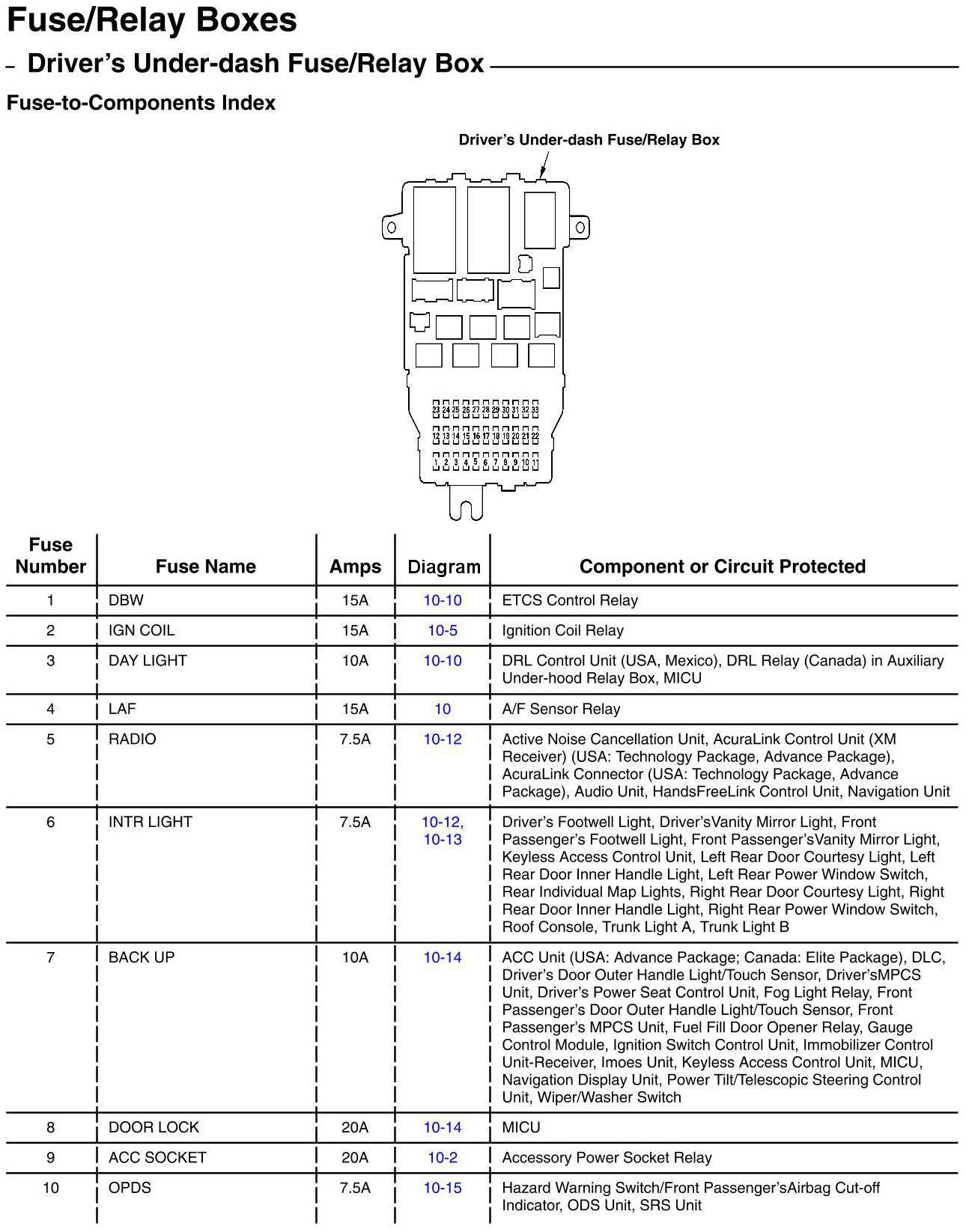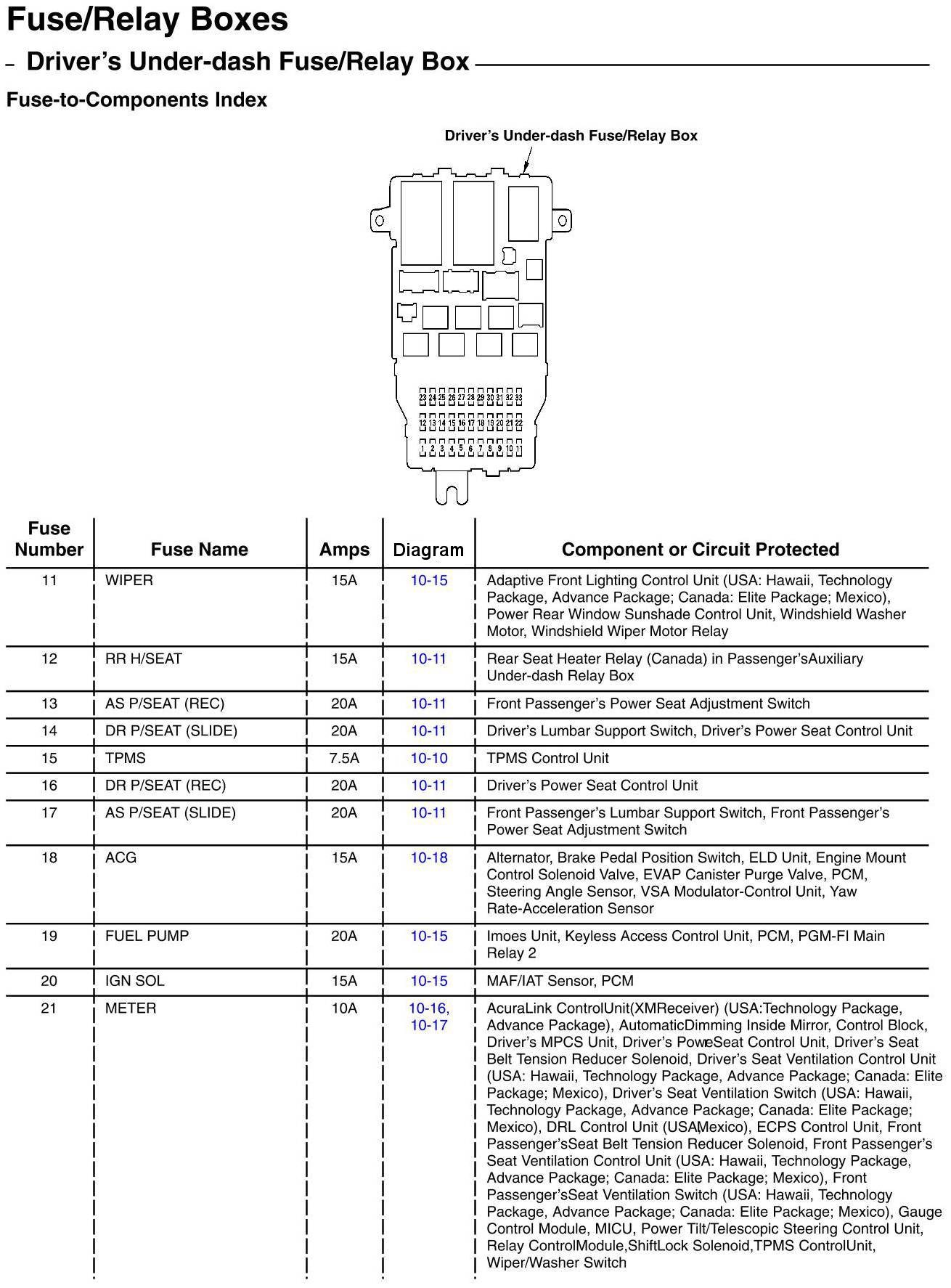 Driver's Under-Dash Fuse/Relay Box - Fuse-to-Components Index