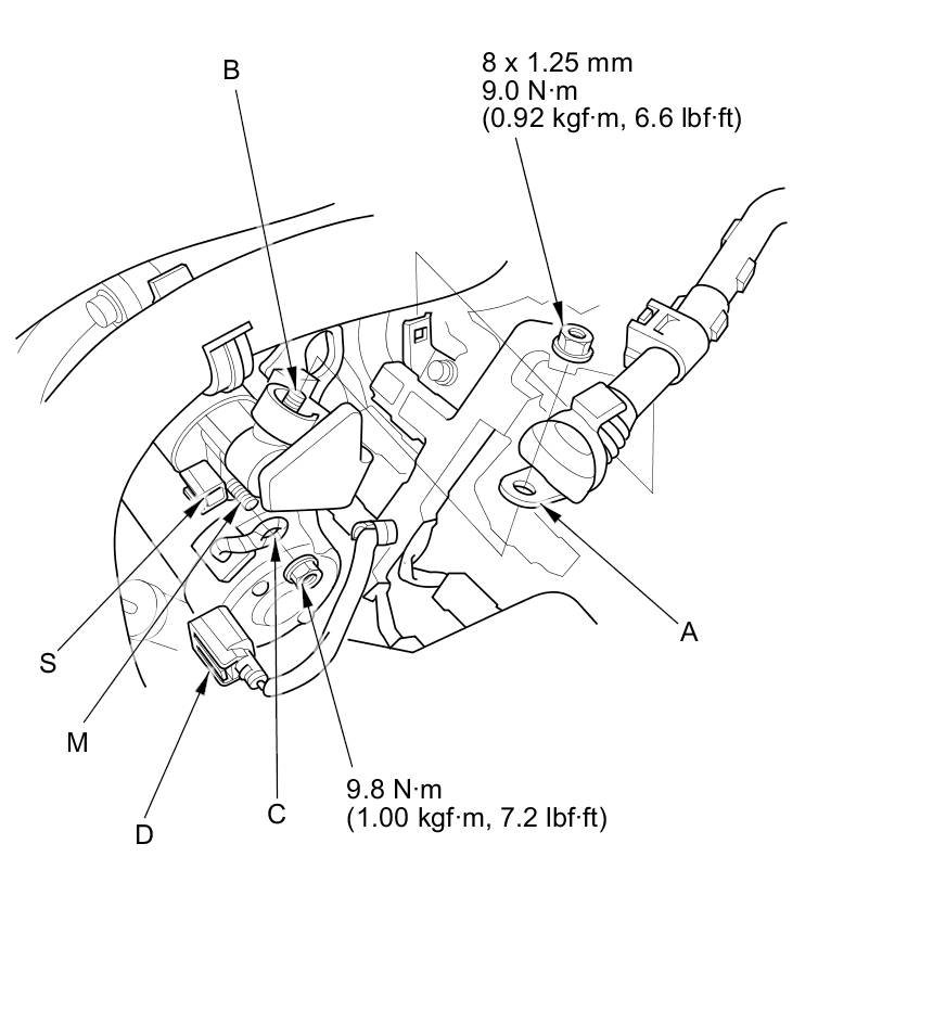 2. Remove the harness clamp (A), then disconnect the positive starter cable (B), the motor wire (C), and the 1P connector (D).