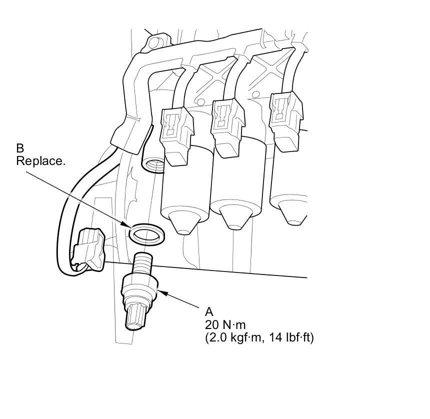 4. Disconnect the line pressure switch connector, and remove the line pressure switch (A) and the sealing washer (B).