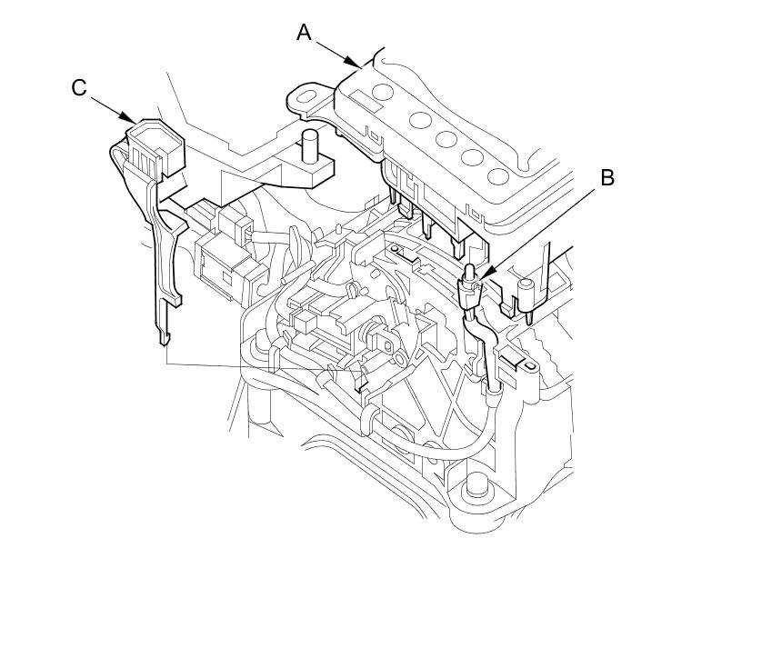 2. Move the A/T gear position indicator panel (A) up from the shift lever bracket by releasing the locks, and remove the A/T gear position indicator panel light bulb socket (B) from the indicator panel base.