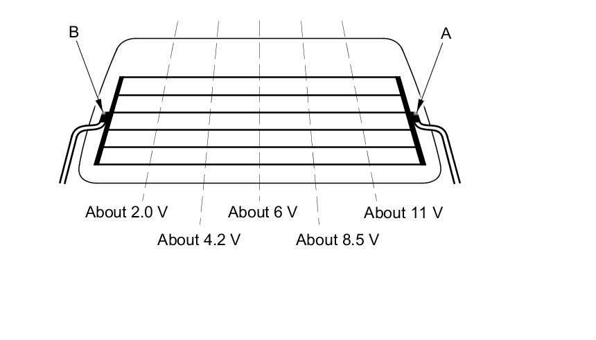 3. Measure the voltage between negative terminal (B) and body ground. There should be less than 0.2 V.