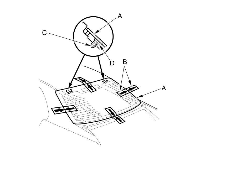 20. Put the cartridge in a caulking gun, and run a continuous bead of the adhesive (A) around the rear window (B) along the edge of the rubber dams (C) and the molding (D) as shown.