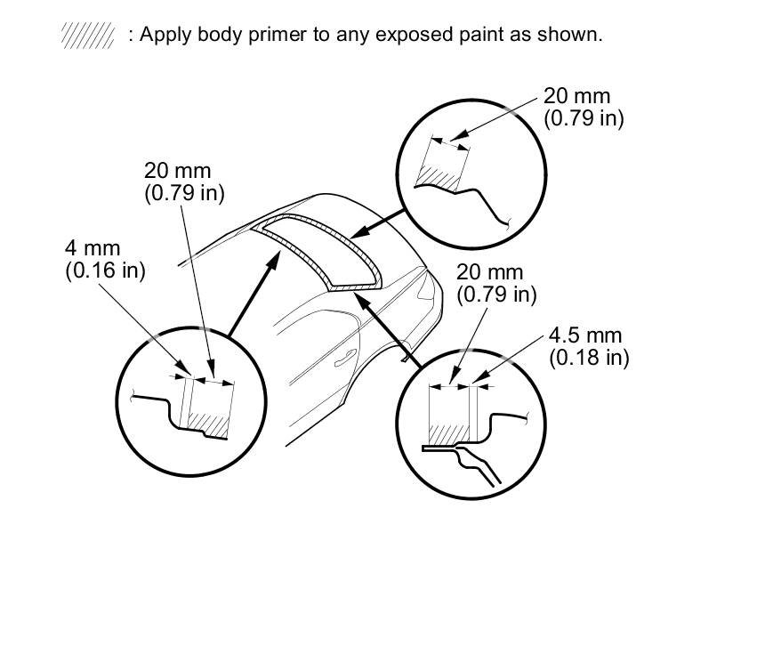 - Never touch the primed surfaces with your hands. If you do, the adhesive may not bond to the rear window properly, causing a leak after the rear window is installed.