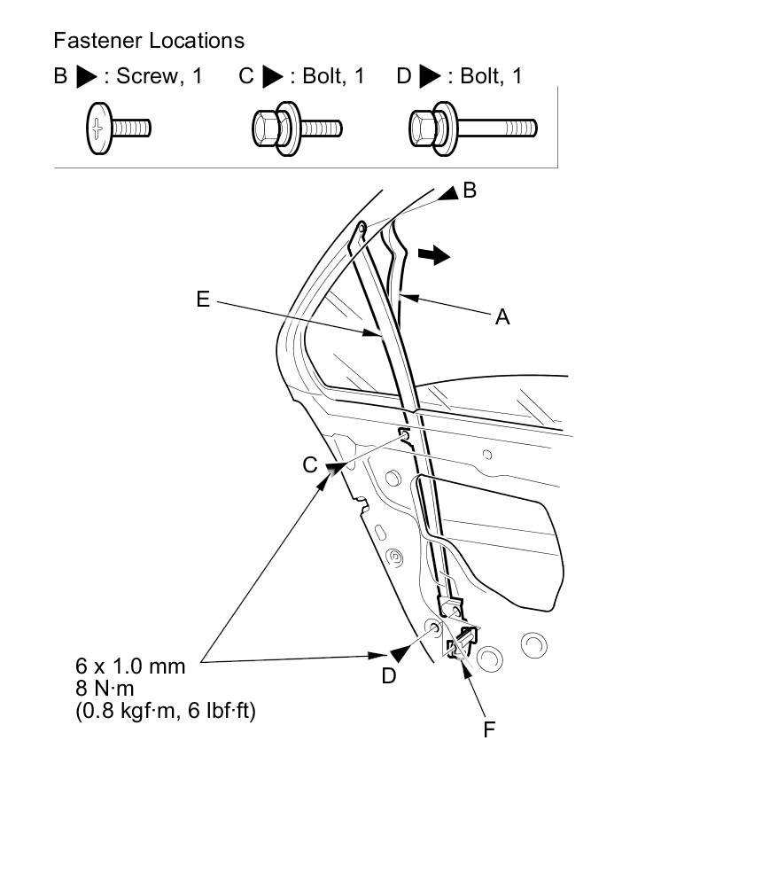 4. Pull the glass run channel (A) away as needed, then remove the screw (B). Remove the bolts (C, D) securing the rear lower channel (E), then remove the collar (F).