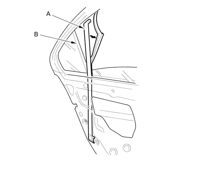 5. Pull the upper portion of the rear lower channel (A) forward to remove it from the door quarter glass seal (B).