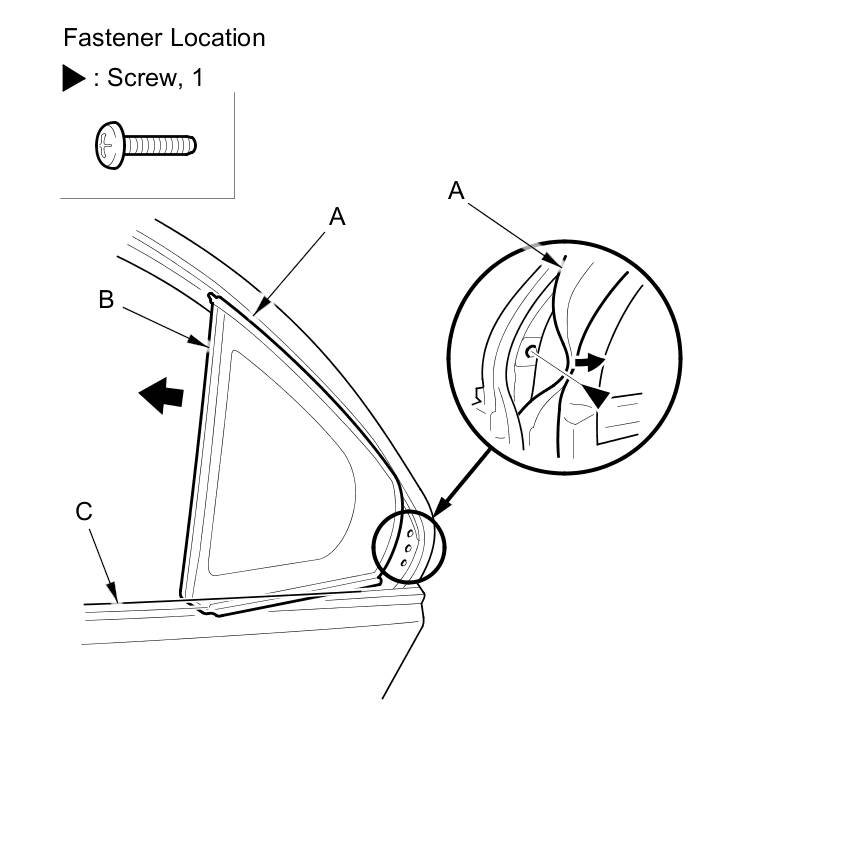 6. Pull the door weatherstrip (A), and remove the screw, then remove the quarter glass (B). Take care not to damage the door glass outer weatherstrip (C).
