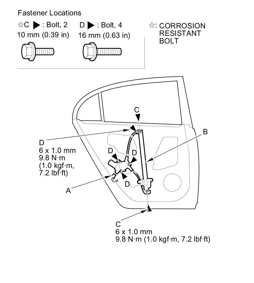 9. Remove the bolts (C), and loosen the bolts (D), then remove the regulator through the hole in the door.