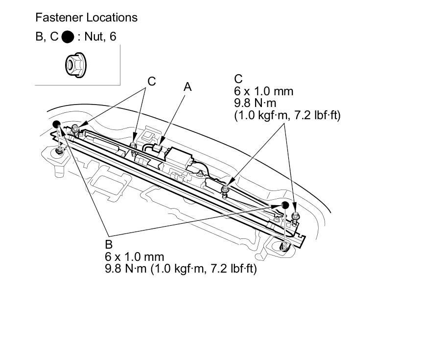 2. Disconnect the power rear sunshade control unit connector (A). Remove the two nuts (B), and loosen the four nuts (C) securing the rear window sunshade.
