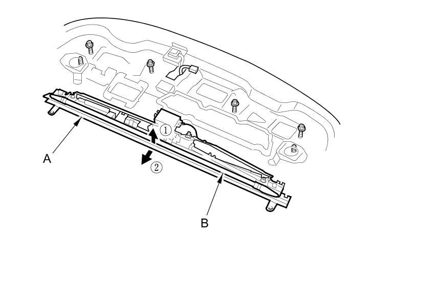 3. While lifting at the front edge of the rear window sunshade (A), slide it forward, then remove it. Do not catch the screen portion (B) while removing the sunshade.