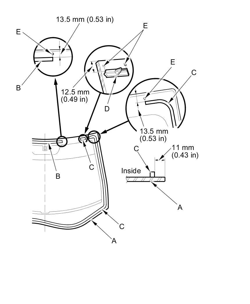 11. Apply glass primer to the upper clip mounting areas on the windshield (A), and let it dry. Remove the adhesive backing, and attach the upper rubber dam (B), the lower rubber dam (C), and the upper clips (D) to the inside face of the windshield as shown:
