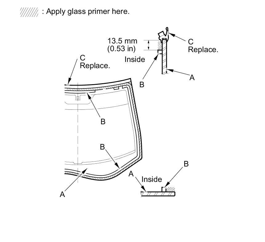 16. Apply a light coat of glass primer to the windshield (A) along the edge of the rubber dams (B) and the windshield molding (C) as shown, then lightly wipe it off with gauze or cheesecloth: